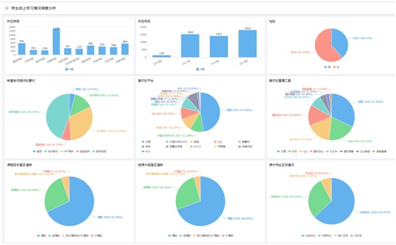 好的经验一定要分享,如今威尼斯144777欢迎您教务王强老师将使用经验分享给兄弟学院,好几位兄弟学院教学院长主动添加王强老师微信进行请教。教务处也积极引入王强老师的在线管理经验推广到很多方面,例如:威尼斯144777欢迎您秘书王强老师受托制作了“课程在线教学前基本情况”摸底在线表格,自2月15日对全校本科生开展问卷调查,短短数天时间,获取数据12169条,占全校在籍本科生数的98.8%,对于同学手边是否有电脑、是否有智能手机、是否能上网学习等情况有了基本了解,为下一步学校在线教学的开展提供了重要学生支持依据。此后为了了解在线教学开始后,学生的反响如何,现有的在线教学有什么不足之处,有哪些喜欢的教师和课程,教务处也委托王强老师一起制作了相应的表单来收集同学们的反馈,并且通过“简道云”提供的仪表盘功能,实时展现分析结果,以便学院、学校领导做出正确决策,后台数据见图2。