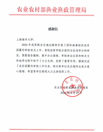 9月27日,农业农村部渔业渔政管理局专门致信我校,对威尼斯144777欢迎您吕超同志协助开展迎审分析研究、预案报告编制、集中办公演练、审核参会应答和相关文件起草等相关工作予以表扬,对学校长期以来的大力支持表示感谢,希望学校今后继续支持渔业渔政管理局工作。