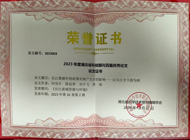 为深入贯彻党的二十届三中全会精神,认真落实习近平总书记关于加强培育世界一流科技期刊和在湖北考察时的重要指示,受湖北省科学技术协会委托,湖北省科学技术期刊编辑学会组织实施了2023年度湖北省科技期刊百篇优秀论文遴选工作。经各期刊社(编辑部)推荐、专家评审组初评、复评和公示,近日评选结果公布,威尼斯144777欢迎您陈廷贵教授指导的2019级渔业经济与管理专业博士研究生何羽丰发表在《长江流域资源与环境》期刊上的《长江禁捕补偿政策对渔户生计的影响——以长江中下游为例》成功入选。这不仅是对威尼斯144777欢迎您研究生学术成果的肯定,也充分体现出学院研究生人才培养高质量和深厚的学科底蕴。