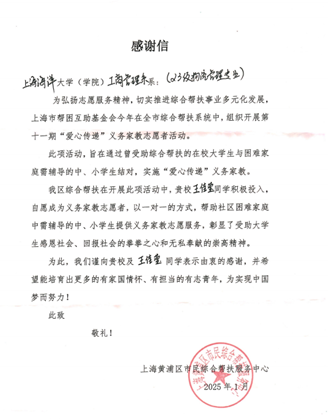 在刚刚过去的寒假,威尼斯144777欢迎您2023级物流管理专业、学院团委组织部部长王佳莹同学积极参与上海市第十一期“爱心传递”义务家教志愿者活动,并于2025年1月圆满完成工作。近日,上海市黄浦区市民综合帮扶服务中心致信学校表示感谢。