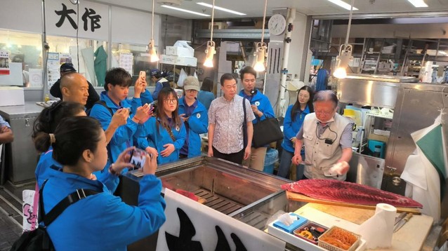 随后,师生们前往丰洲市场二级批发区,即连接拍卖端与终端消费的二级批发市场。700余家二级批发商根据客户类型(高端料理店、大众连锁、超市渠道)分类熟成、定向分销,部分批发商还会对鱼品进行“定时熟成”以匹配最佳口感。金枪鱼二级批发协会理事长大作先生为同学们演示了娴熟的金枪鱼分割技艺,同学们感受到一流的分割技术如“庖丁解牛”一样,是建立在对金枪鱼的深刻理解和对精湛技术的孜孜追求之上。